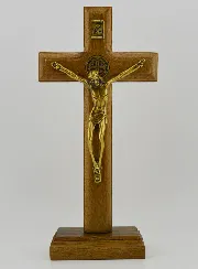 Kruzifix des Heiligen Benedikt aus Holz auf Sockel - 9cm, dieses Stehkreuz ist aus hellem Holz, der Korpus ist aus bronzefarbenem Metall.