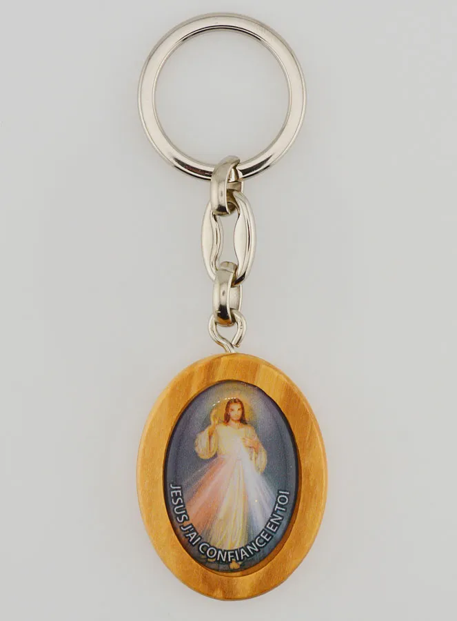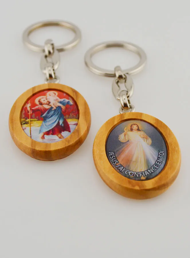 Doppelseitiger Schlüsselanhänger - Heiliger Christophorus & Barmherziger Christus, dieser hübsche doppelseitige Schlüsselanhänger aus Olivenholz enthält zwei Harzplatten mit den Abbildungen des Heiligen Christophorus und des Barmherzigen Jesus Christus.